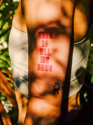 Man with a yellow beanie and orange glasses showing a detailed tattoo on his arm.