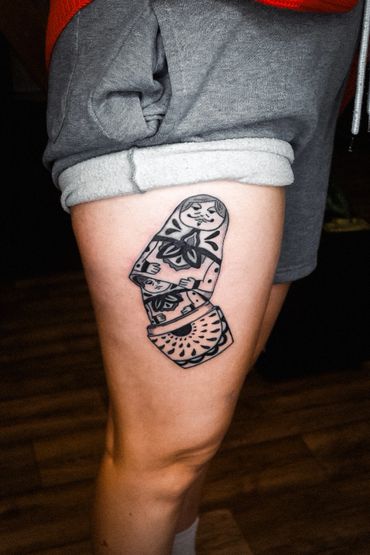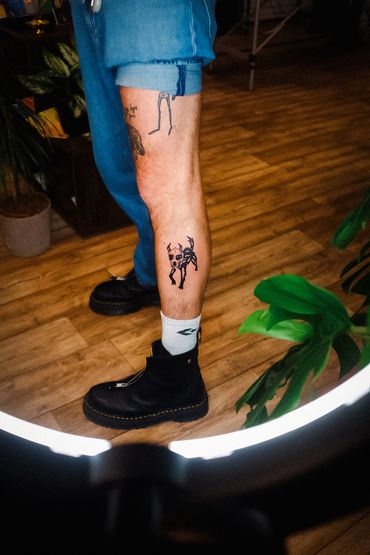 Black ink tattoo of a creature with a skull-like face on a person's leg.