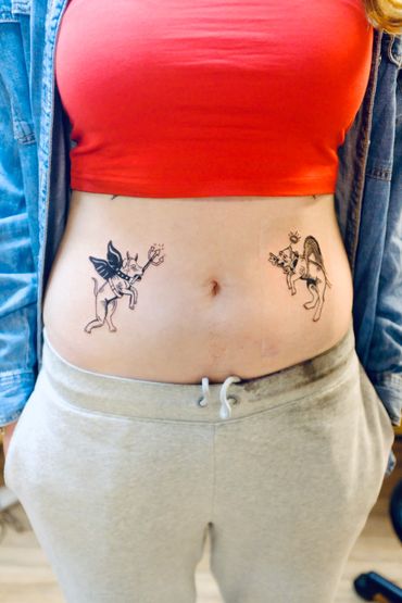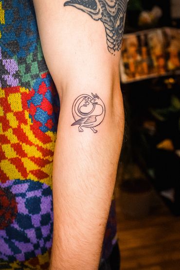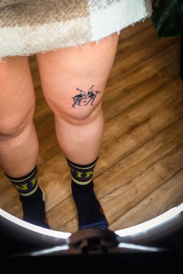 Tattoo of dancing jester figures on a forearm with stars around them.