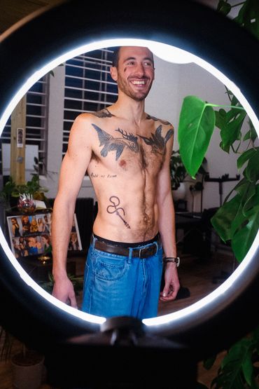 Person showing thigh tattoos through a striped shirt, standing on wooden floor.